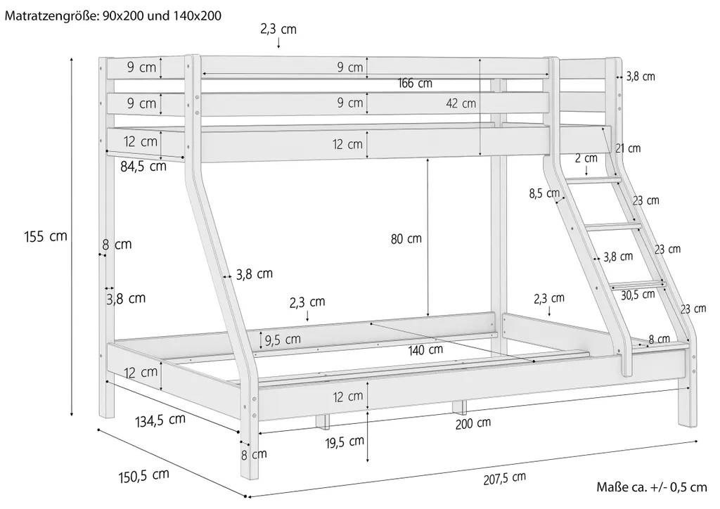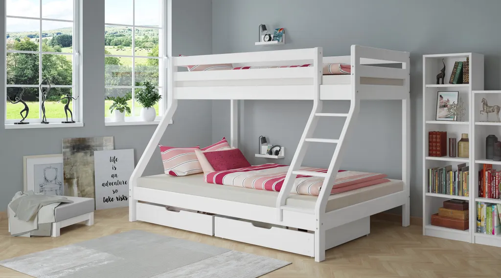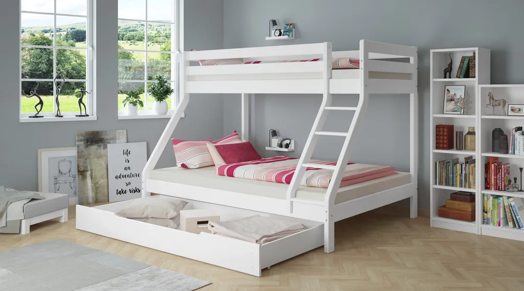 Doppel-Etagenbett Weiß 140×200 Und 90×200 Erwachsenen-Stockbett Kiefer Massivholz V-60.19-09-14WRollrost Inkl.