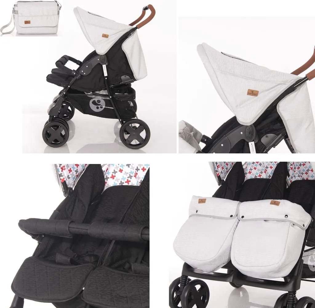 Lorelli Zwillingskinderwagen TWIN Wickeltasche Einhand-Klappsystem Fußabdeckung Grau Weiss