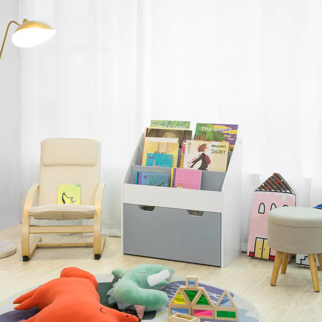 SoBuy KMB17-HG Kinder Bücherregal Kinderregal Mit 3 Ablagefächern Und Einer Herausnehmbaren Spielzeugtruhe Aufbewahrungsregal Für Kinder Weiß/Grau