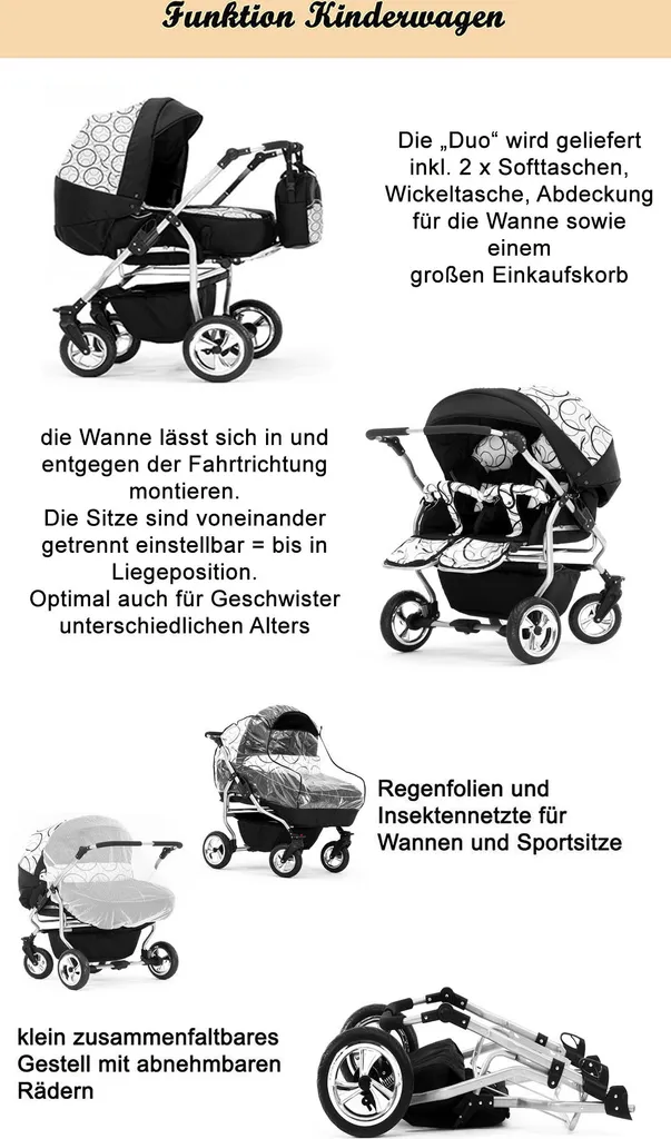 Zwillingskinderwagen „Duo“ 4 In 1 – Sportsitz, Autositz, Iso Bases, Zubehör